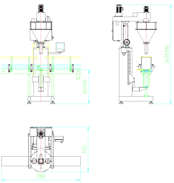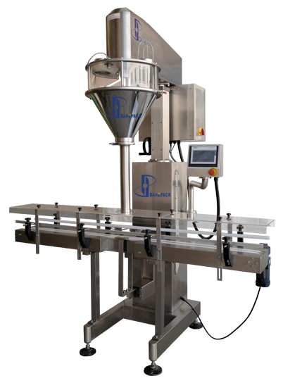 該機主要針對容易揚塵的超細粉末及高精度的包裝要求而開發(fā)設(shè)計,能完成瓶子自動定位和升降、充填及計量等工作,它由一臺稱重式螺桿充填機、一臺鏈板輸送帶及一個氣動定位裝置組成,根據(jù)裝在容器下面的重量傳感器給出的信號完成雙速充填、計量及升降等工作。適用于包裝添加劑、碳粉、滅火器干粉、其它超細粉末、及有高精度包裝要求的粉末等。