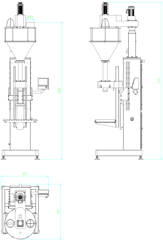 工作流程:人工套袋或人工放罐 → 容器升高 → 快速充填,同時(shí)容器下降 → 重量達(dá)到預(yù)量值 → 慢速充填 → 重量達(dá)到目標(biāo)值 → 人工取出容器。