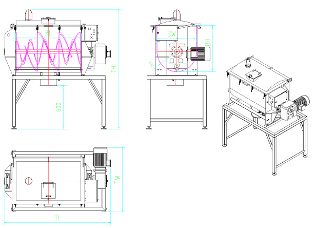 該機(jī)型為臥式筒體,單軸雙螺帶對(duì)稱分布結(jié)構(gòu)。混合機(jī)筒體為U型,在頂蓋或筒體上部有進(jìn)料口,根據(jù)用戶需要其上可裝噴霧加液裝置。筒體內(nèi)裝有單軸轉(zhuǎn)子,轉(zhuǎn)子是由軸、橫撐及螺帶組成。